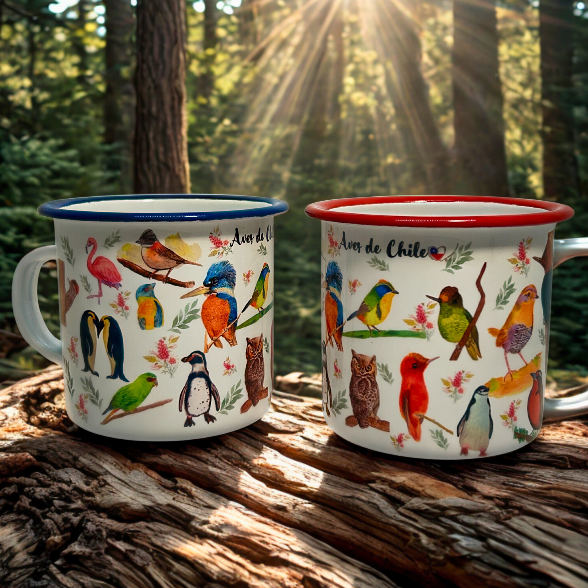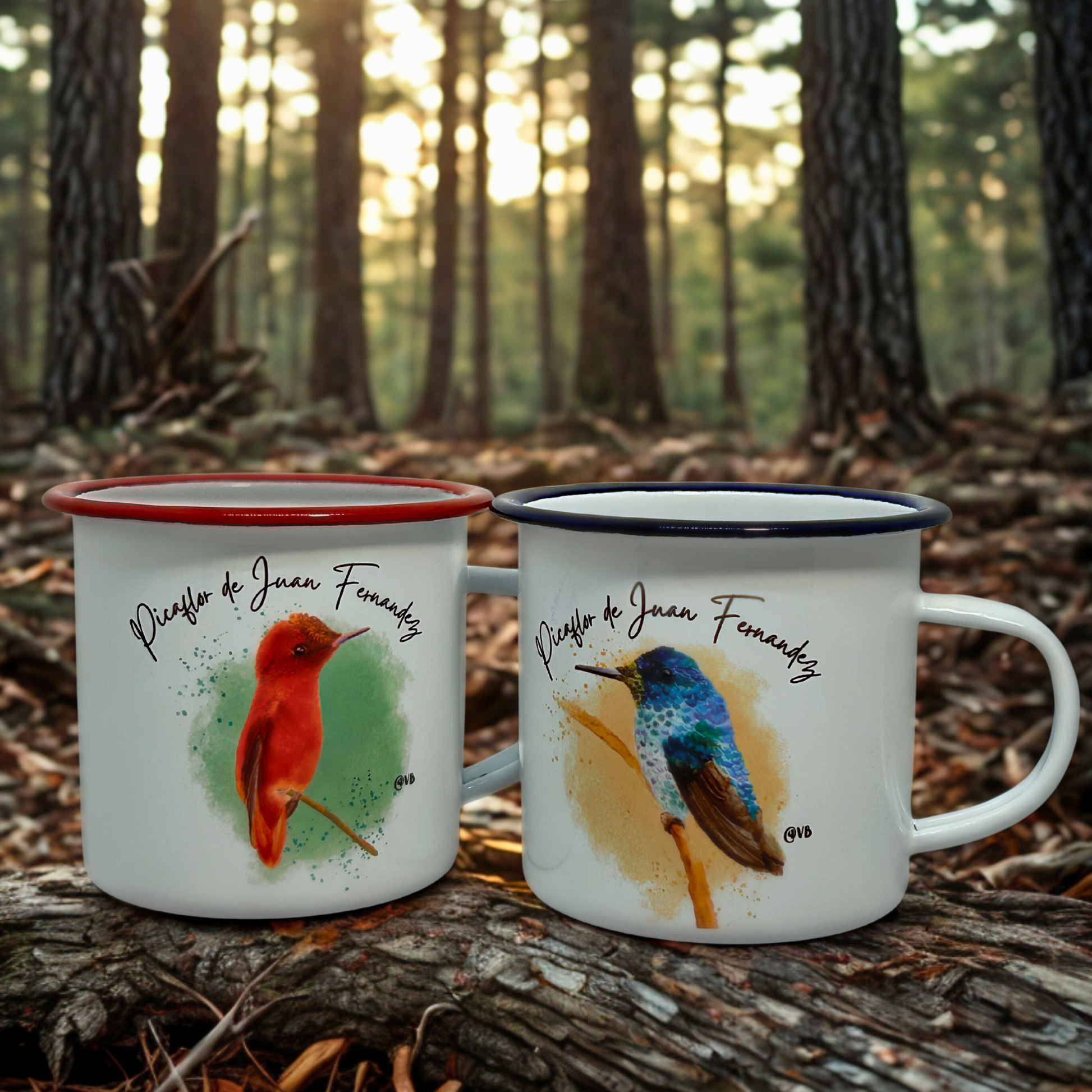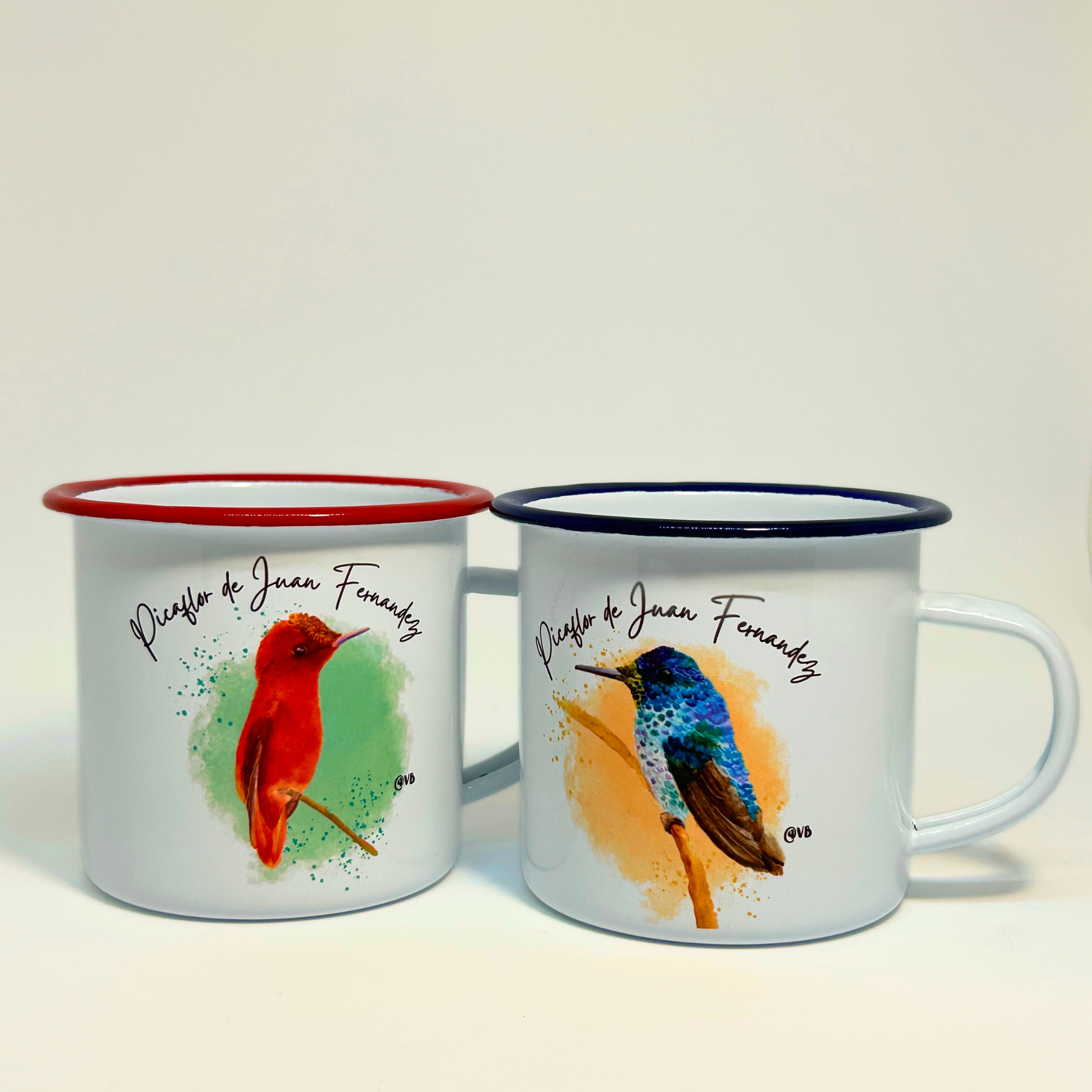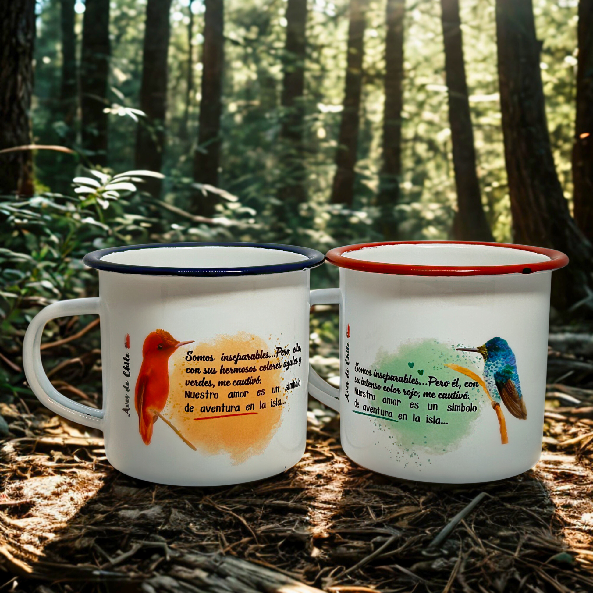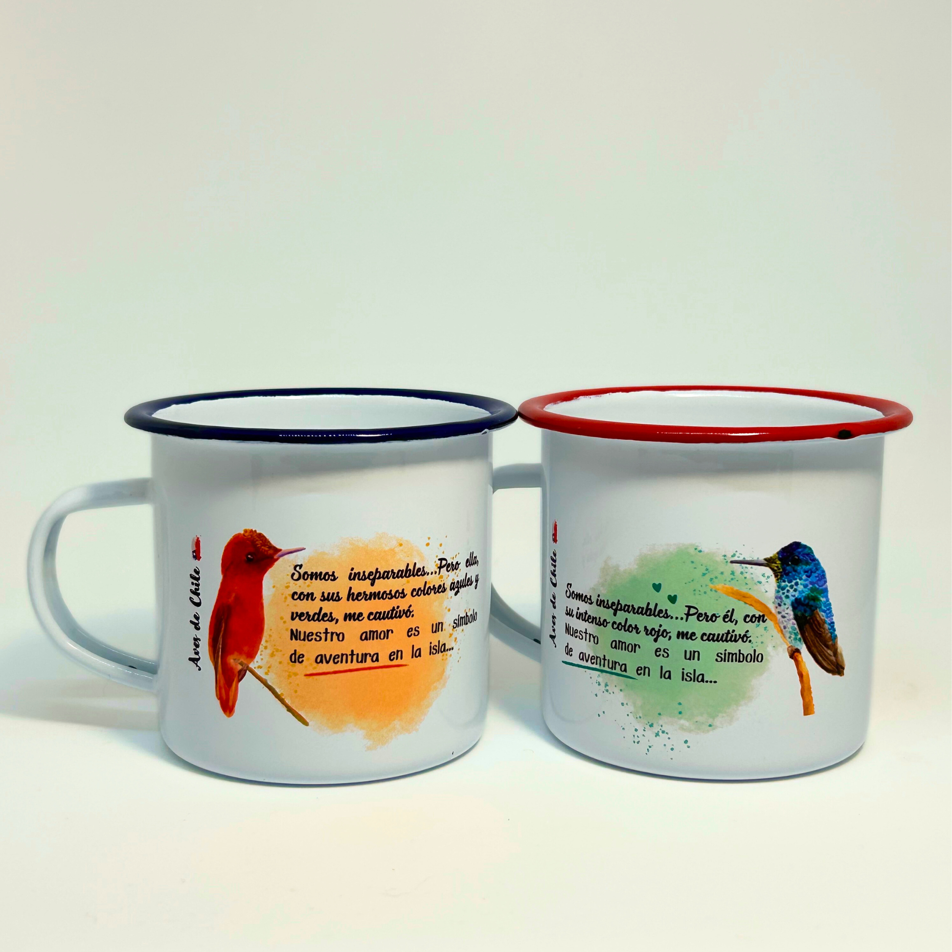 El amor también es chileno. Set de 2 tazones enlozados con el picaflor macho y hembra de Juan Fernández - una especie endémica y romántica.